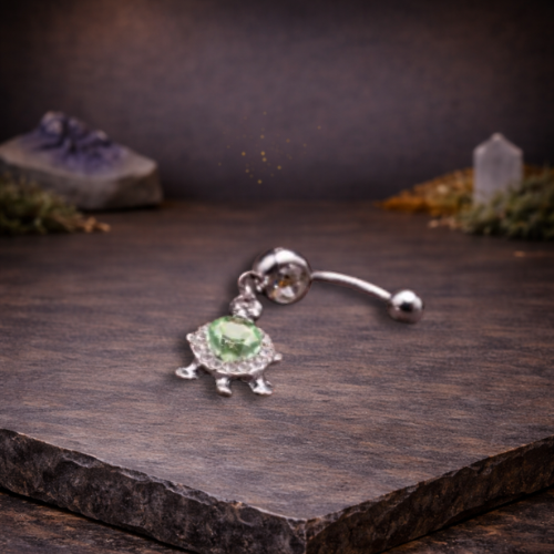 De Celestial Guardian Navel Bar voelt als een klein talisman dat je met je meedraagt. Het zachte groene centrum vangt het licht op een rustige manier, terwijl de omliggende details zorgen voor een bijna mystieke uitstraling.