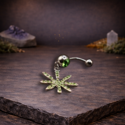 De Emerald Leaf Drop Navel Bar combineert een diepe groene steen met een speelse hanger in bladvorm. Het ontwerp voelt natuurlijk, maar tegelijkertijd gedurfd — alsof je een stukje energie van buiten met je meedraagt.
