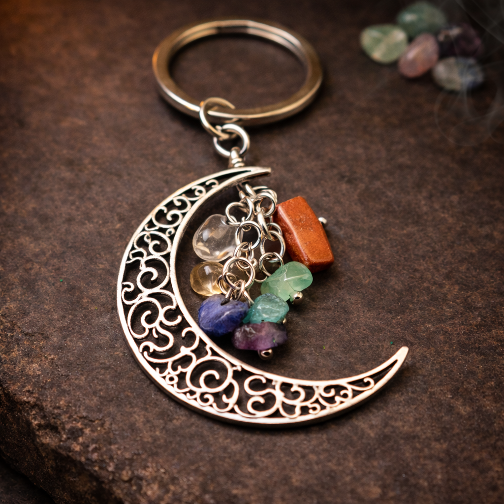 Een elegante maanvormige sleutelhanger met zorgvuldig gekozen natuurstenen.