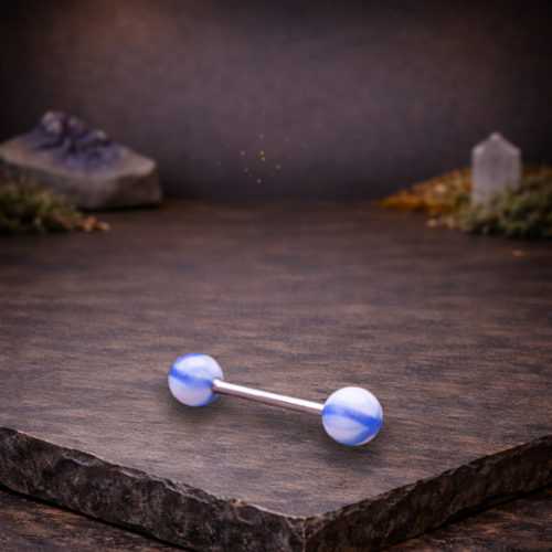 Een zachte blauw-witte tongpiercing met een vloeiende, kalmerende uitstraling.