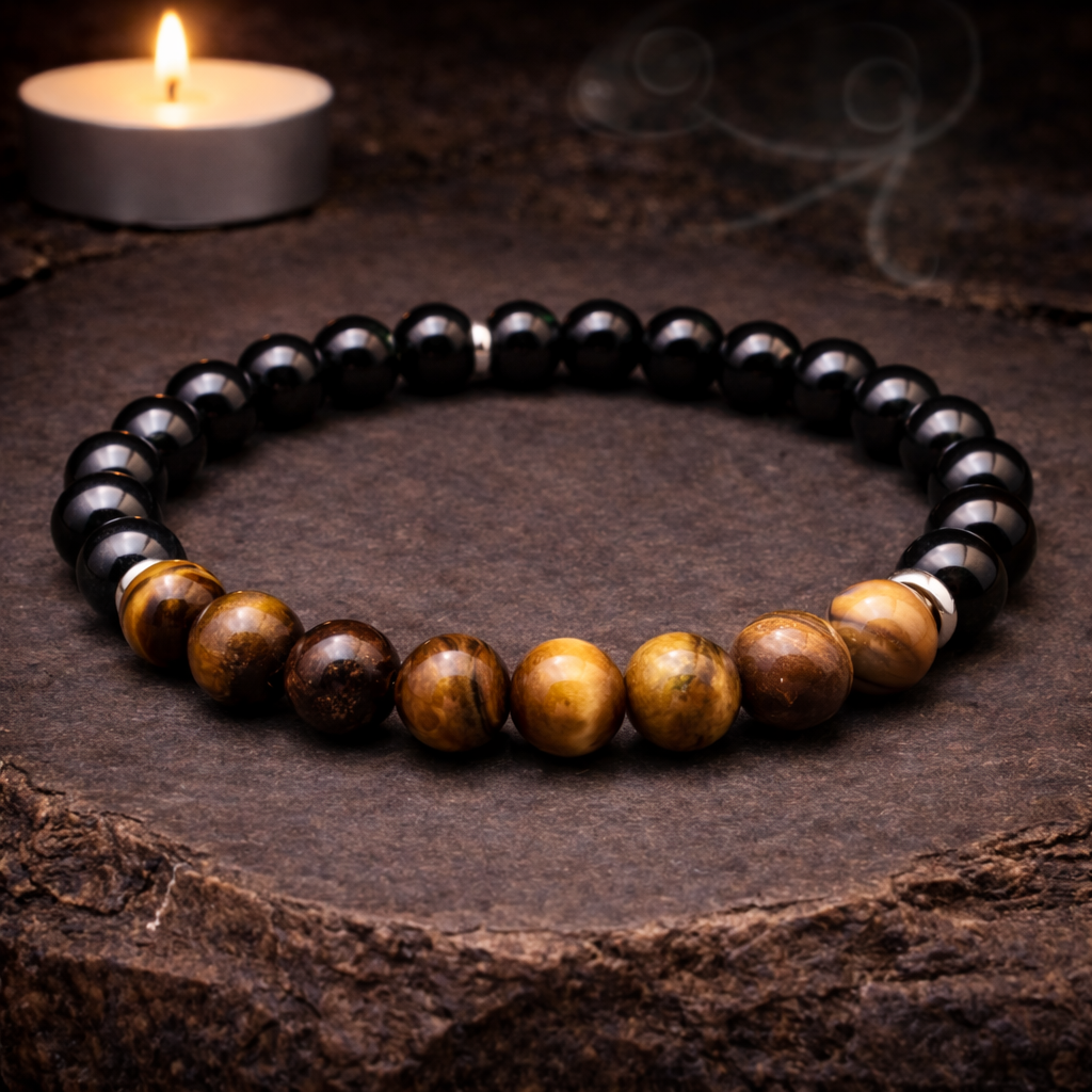 Tijgeroog staat symbool voor moed, helderheid en het vertrouwen om je eigen pad te volgen. De steen helpt je stevig te blijven staan, juist wanneer alles om je heen beweegt. Zwarte onyx werkt beschermend en ondersteunend, als een stille wachter die ruis en overtollige energie op afstand houdt.